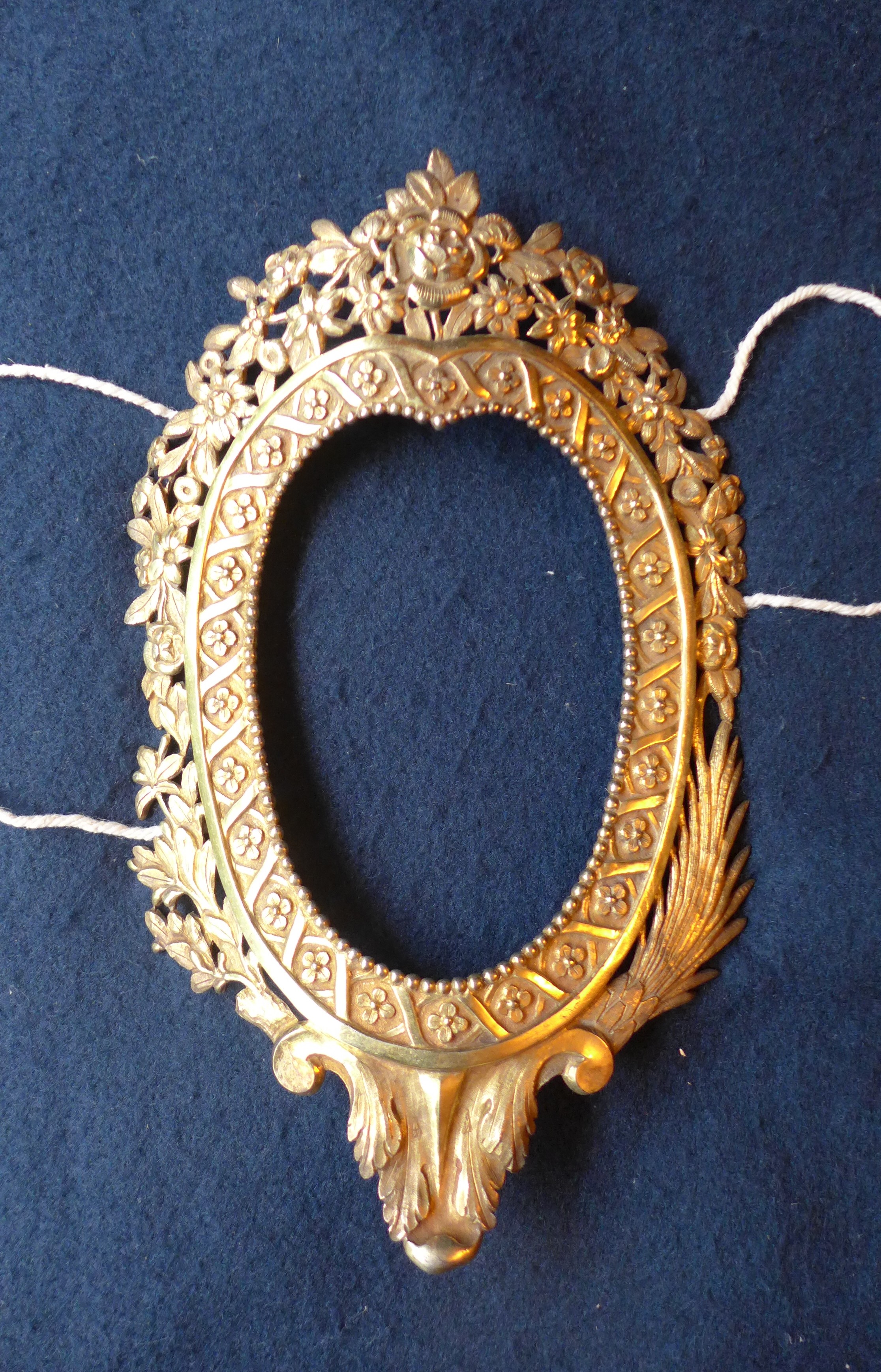 Rostrillo perteneciente al ajuar de la Virgen de Pascua de la iglesia de San Martín de Salas de los Barrios. Se compone de una orla interior oval con cenefas de perlas y flores. Alrededor de ella se compone un juego floral con motivos fitomorfos diversos, que se asemejan a los gustos del estilo imperio.