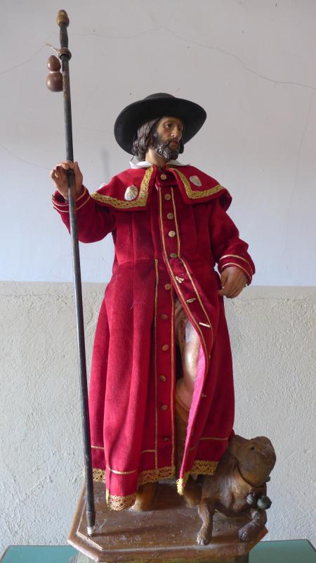 San Roque, travestido con los símbolos jacobeos (bordón con calabaza, sombrero de ala ancha, esclavina con veneras) está de pie, con una pierna adelantada y el perro a sus pies.