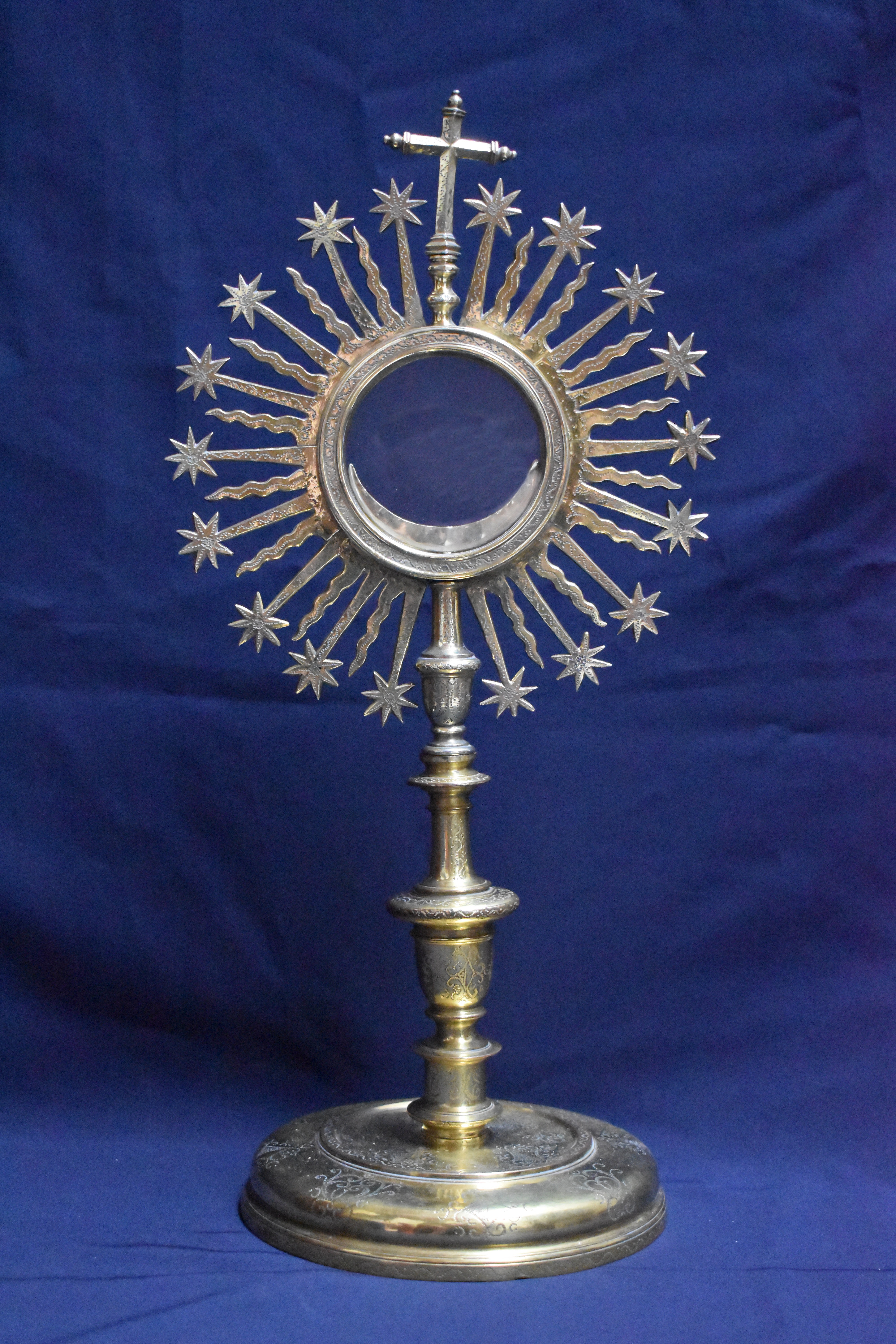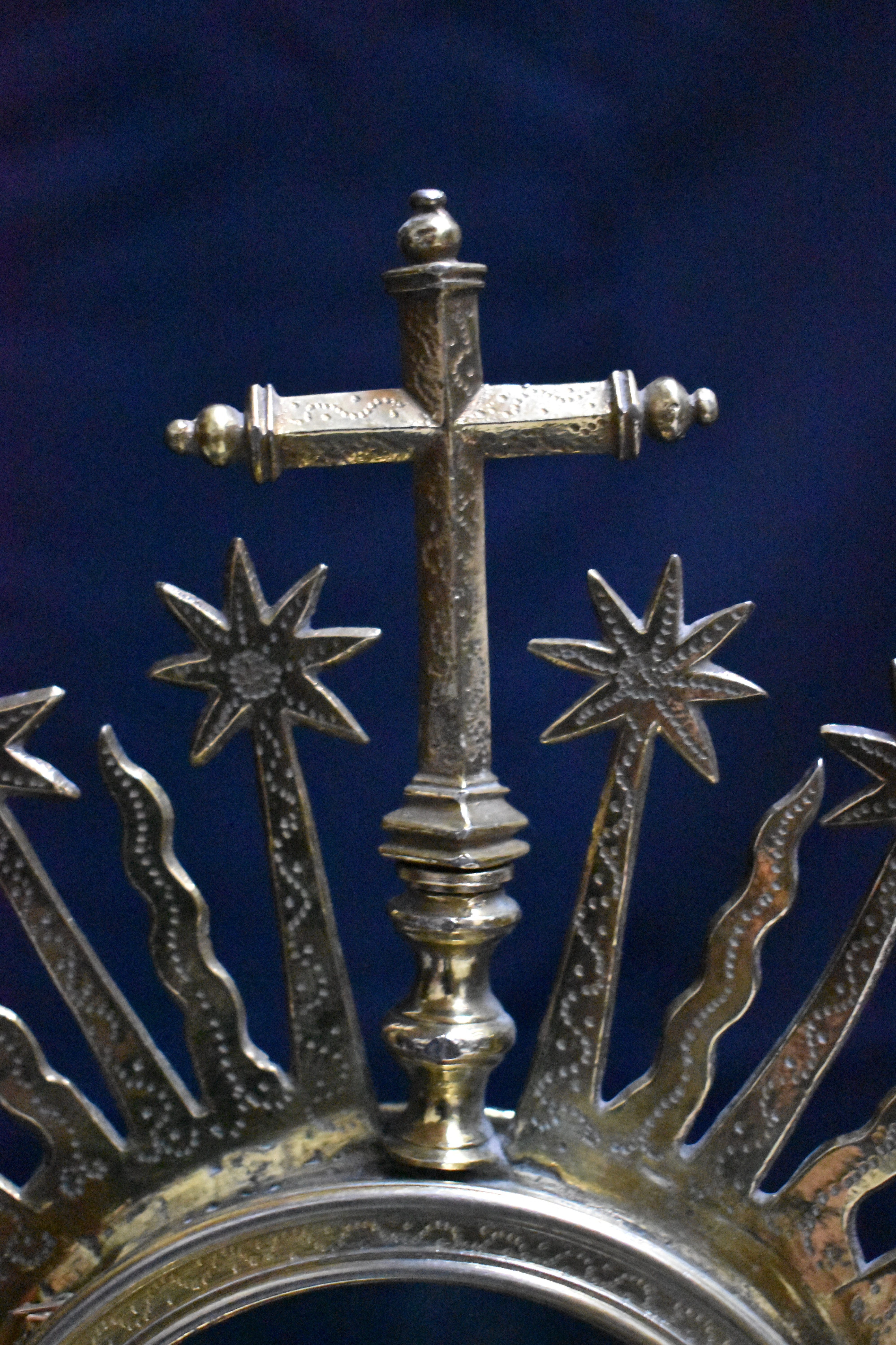 Custodia portátil o de tipo ostensorio compuesta a base de pie circular moldurado, gollete de tipo "carrete", astil abalaustrado con nudo periforme y ostensorio circular rodeado de rayos lisos y flameados que alternan. El pie porta diversos ornatos punteados realizados a buril que reproducen motivos vegetales y geométricos, algo que, en realidad, se reparte por la superficie de toda la pieza, como es habitual en mucha obras de mediados del siglo XVII. El conjunto remata en cruz latina de brazos prismáticos y perillones terminales. Dada la cronología de la pieza la ornamentación de picada de lustre jugó un papel fundamental como puede verse en toda su superficie.