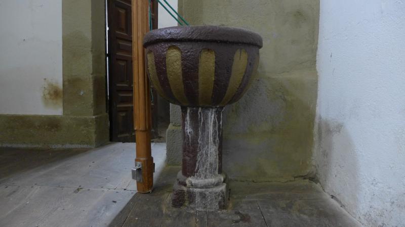 En la iglesia se conservan varias pilas bautismales que, si bien hacen juego entre ellas, no son exactamente iguales que la pila bautismal. La que nos ocupa consta de basa cuadrangular y pie prismático con un collarino en la parte inferior. La copa es semiesférica y va decorada con gallones que se rematan en forma curva en su parte superior. La boca va marcada con ligero saliente de perfil curvo. En cronología posterior se policromarían en color marrón oscuro, marcando los gallones en dorado.