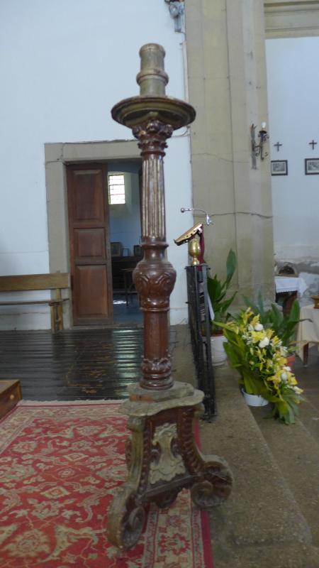 él se dispone un largo vástago, torneado, con una zona inferior ornada con motivos vegetales y una especie de nudo ajarronado en el centro, y una zona superior que se asemeja a una columna de fuste estriado y capitel compuesto. El mechero va precedido de un plato circular de borde moldurado y se compone de dos piezas cilíndricas superpuestas. Ambos tienen idéntica forma y decoración, con motivos más próximos al mundo rococó y ostros que preludian los gustos neoclásicos.