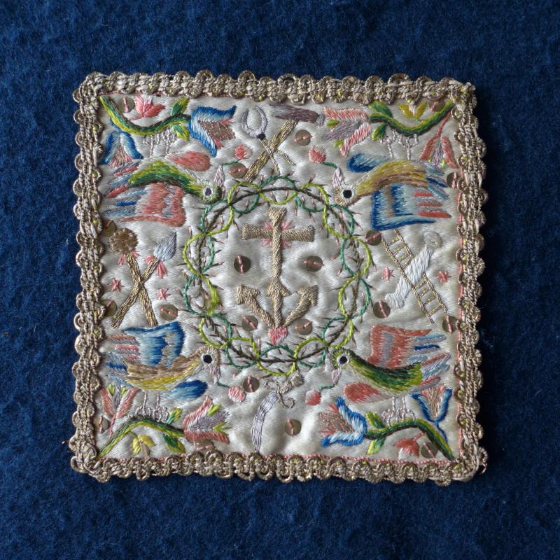 Este ornamento, que sigue en uso en la iglesia de Santa Columna, es una pieza cuadrangular de raso, bordada con hilos de colores y perimetrada con una especie de puntilla o galón de hilo dorado. Lo más interesante es la labor de bordado llevada a cabo en toda su superficie, con hilos azules, verdes, rosas y amarillos, que efigian pajarillos y representaciones de los arma Christi. En su parte central, enmarcado por un óvalo y lo que podría tomarse como una corona de espinas, aparece una cruz sobre el Calvario y tres clavos. El reverso es de otro tejido, menos rico, quizá un lienzo.