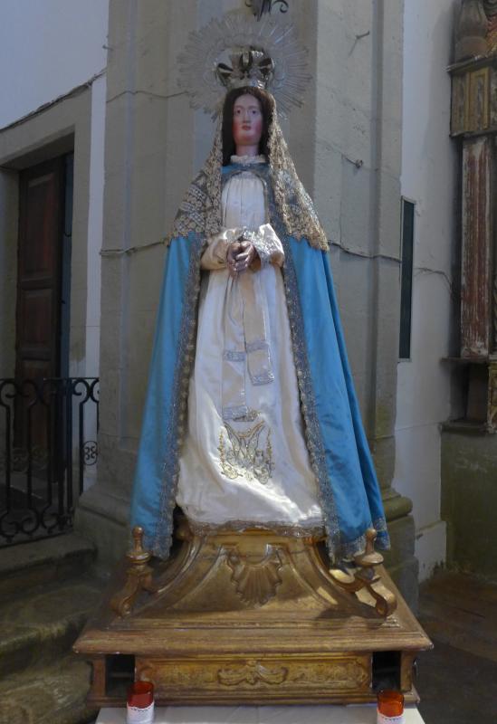 Su cara es alargada, de severo rictus y escasa definición en sus facciones. Lleva pelo natural. Aunque tiene otras prendas de ajuar, al momento de su catalogación vestía túnica talar hasta los pies, manto azul cielo con puntilla plateada y toca calada de hilo. Sobre la cabeza lleva una corona de hojalata de cronología contemporánea, seguramente coetánea a la propia imagen.