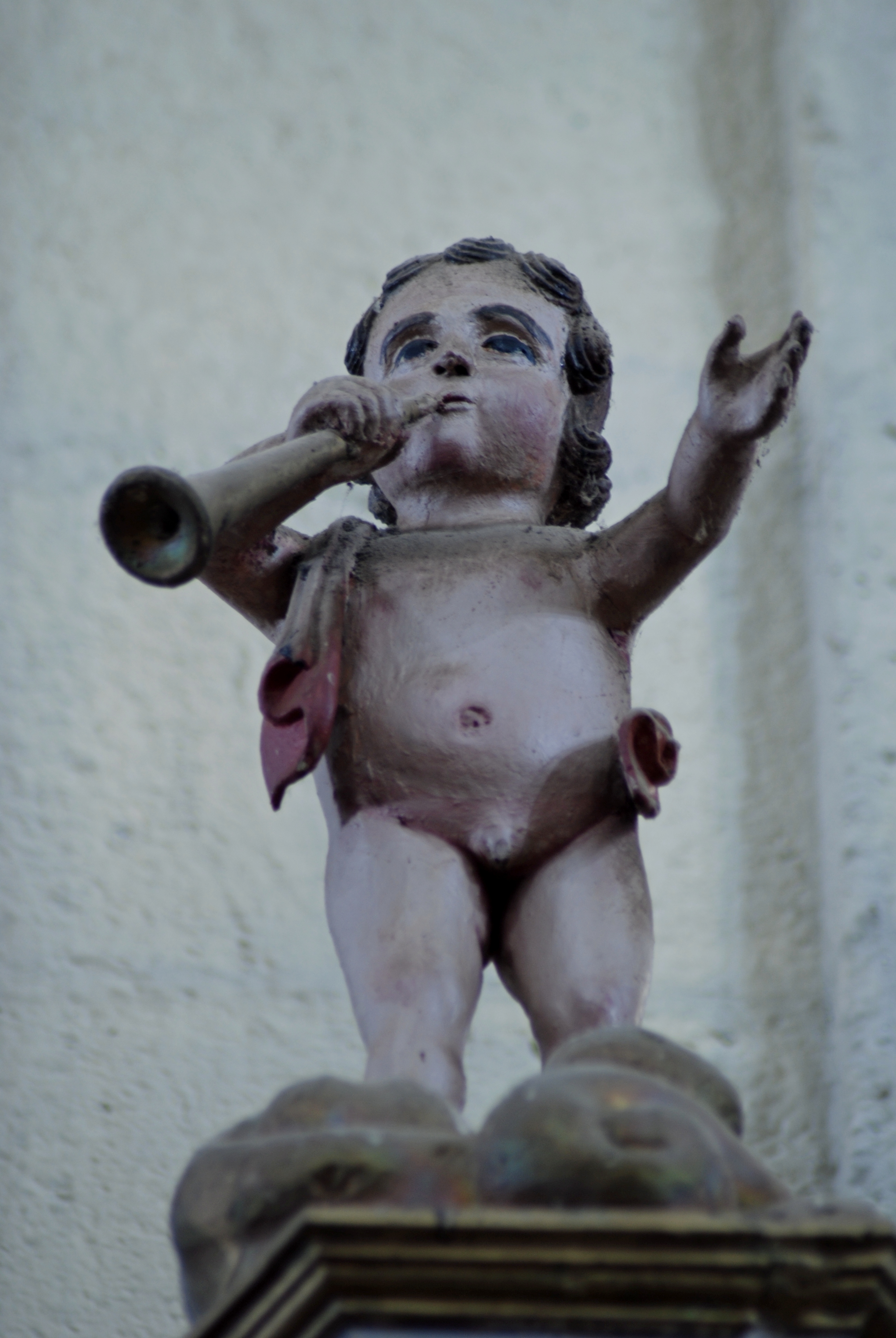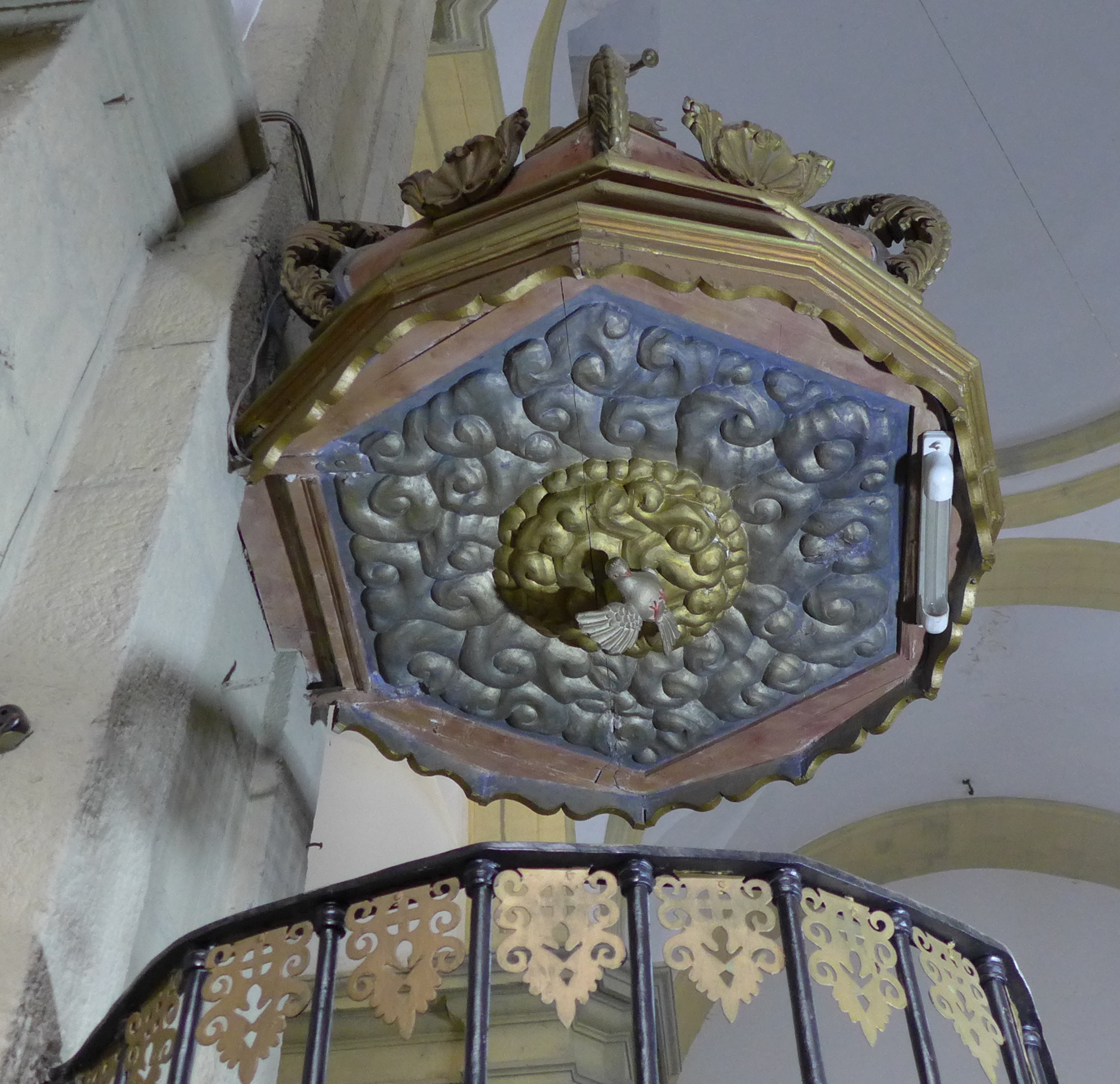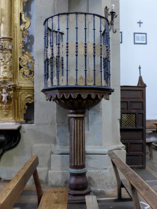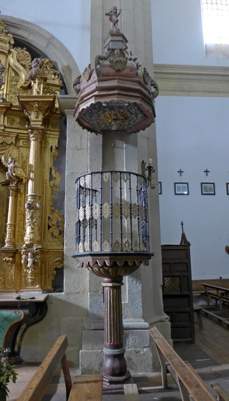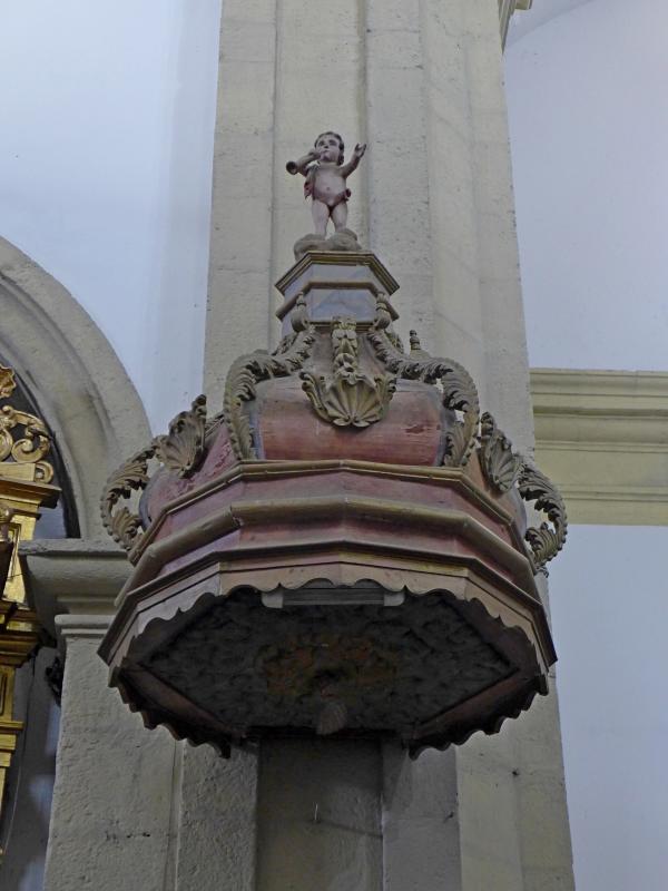 Su basa es prismática y su pie tiene forma de columna acanalada alzada sobre una basa bulbosa y rematada por una copa circular abocelada y decorada con gallones. Frente a la piedra de la anterior estructura, para la tribuna se utilizó el hierro, barrones de forja, torneados y decorados con chapas caladas con motivos vegetales y doradas. Por último, el tornavoz es la pieza más compleja y elaborada, compuesta de varios cuerpos superpuestos de los perfiles más diversos, siendo el final de forma bulbosa y con aristas resaltadas por piezas de talla que simulan vegetales y se acompañan de rocallas en sus frentes. En la coronación, y sobre una base octogonal un Niño de bulto redondo tocando una trompa.