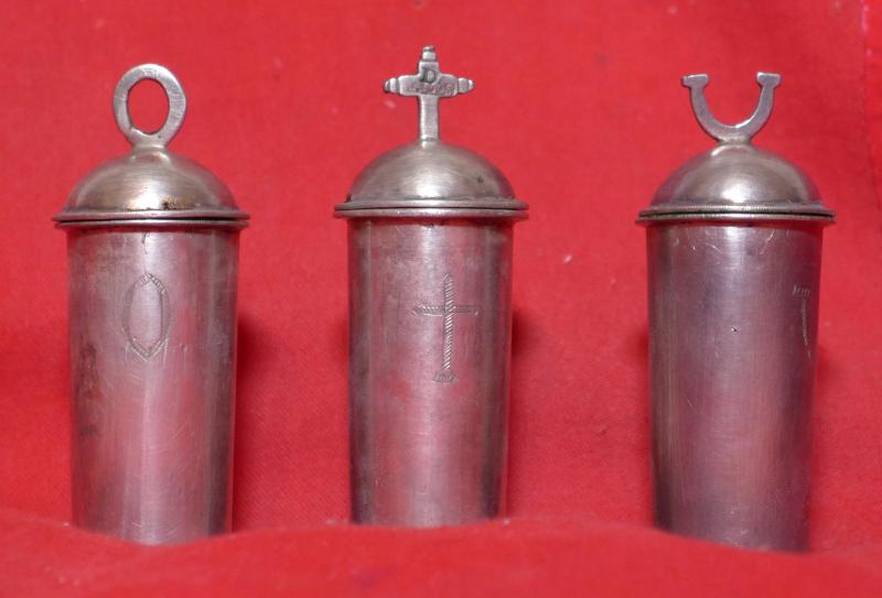 Las olieras son cilíndricas, elaboradas con una pestaña saliente en la parte superior. Sobre ella se dispone una tapadera semiesférica con un remate de fundición sobre ella alusiva a su contenido (O, cruz latina, V), que encuentra su correspondencia en la propia oliera, pero con los mismos símbolos grabados.