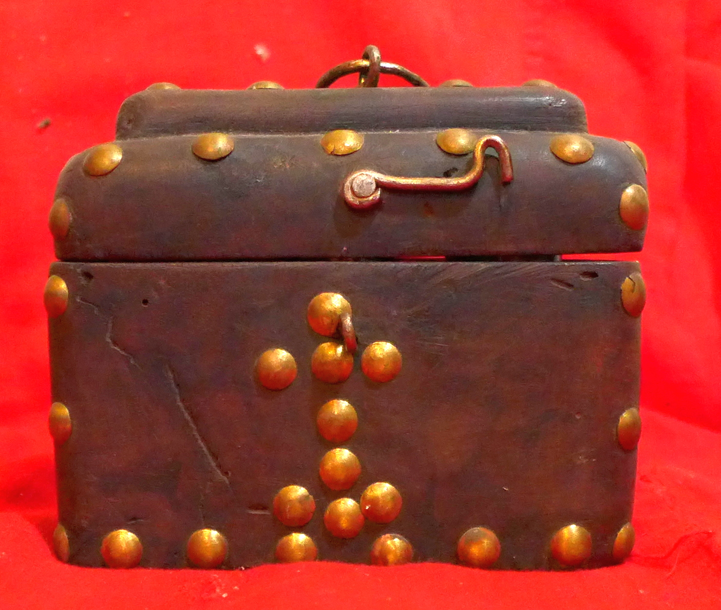 Caja prismática con tapadera de dos cuerpos superpuestos de borde abocelado. Toda la superficie se decora con clavos circulares dorados, a modo de chinchetas, que en en frente componen una cruz sobre el Calvario. En el interior de la caja se practicaron tres huecos cilíndricos, con sus correspondientes oquedades en el interior de la tapa. En la parte superior se grabaron las iniciales para ubicaron correctamente los recipientes.