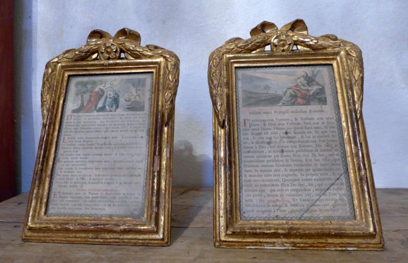 Pequeñas sacras laterales, con texto impreso y grabado coloreado. El marco es rectangular y de liso molduraje, salvo en la parte superior donde se talló una composición de telas colgantes y motivos fitomorfos, típicos ya del siglo XIX y del estilo imperio, por ejemplo. El pie que las soporta por su parte trasera ha sido añadido modernamente.