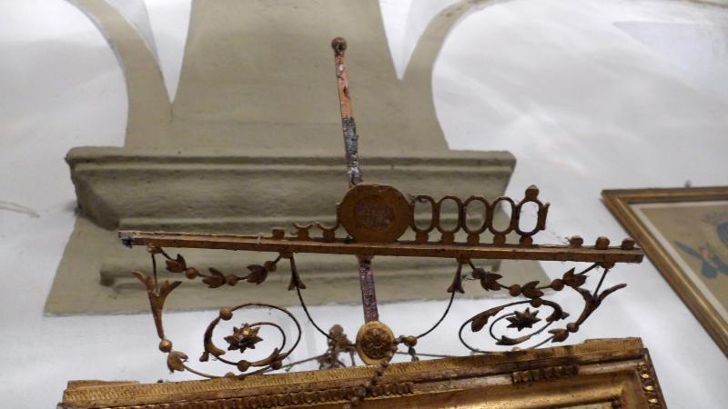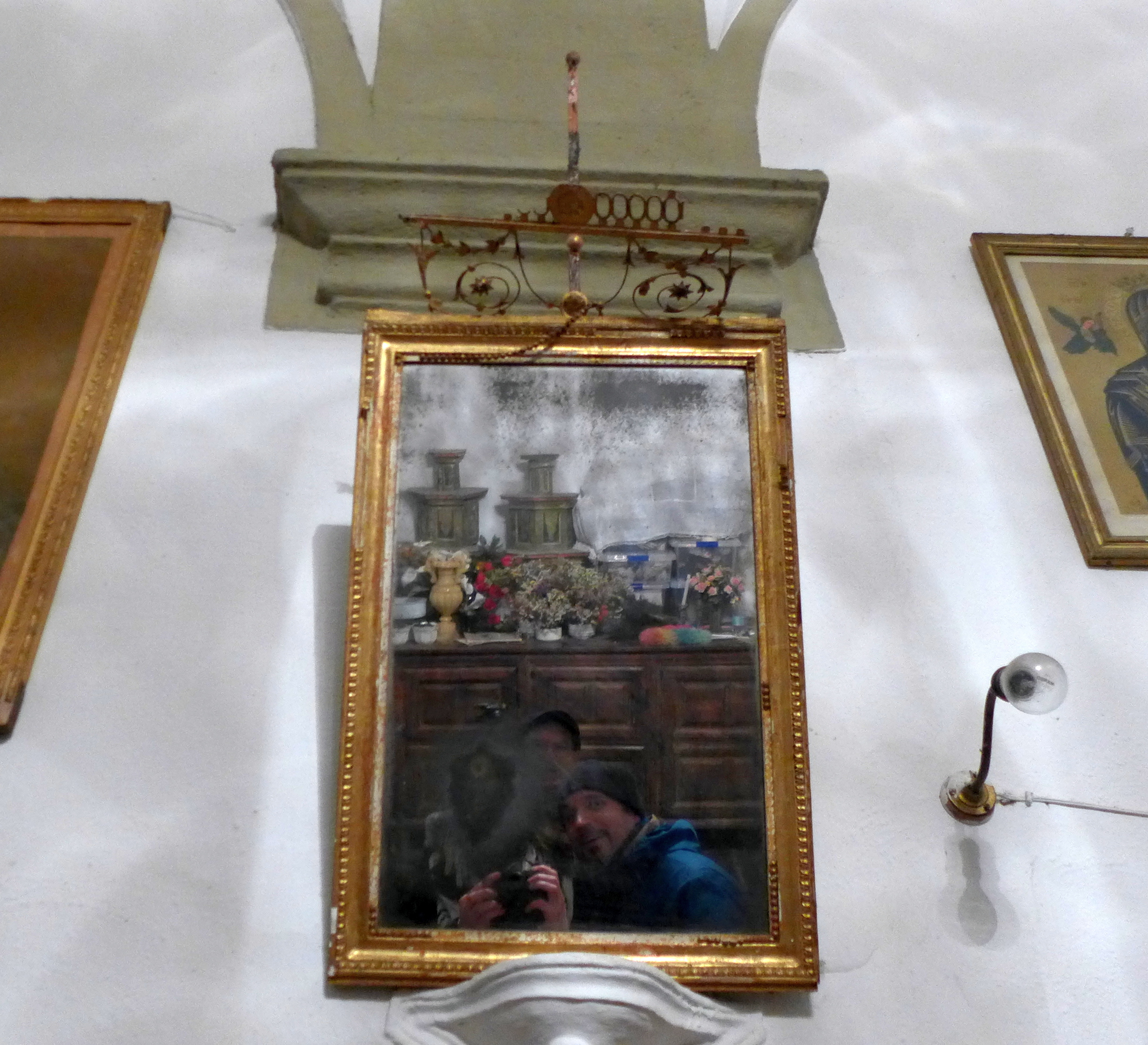 Espejo rectangular ubicado en la sacristía parroquial. Consta de marco rectangular, dorado, moldurada y decorado con cenefas de contario. El espejo propiamente dicho es el original y su azogue se encuentra parcialmente perdido en la parte inferior. Sobre el conjunto se dispone un remate o cimera de metal, algo deteriorado, que motivos vegetales y geométricos, dotando al conjunto de una cierta elegancia.
