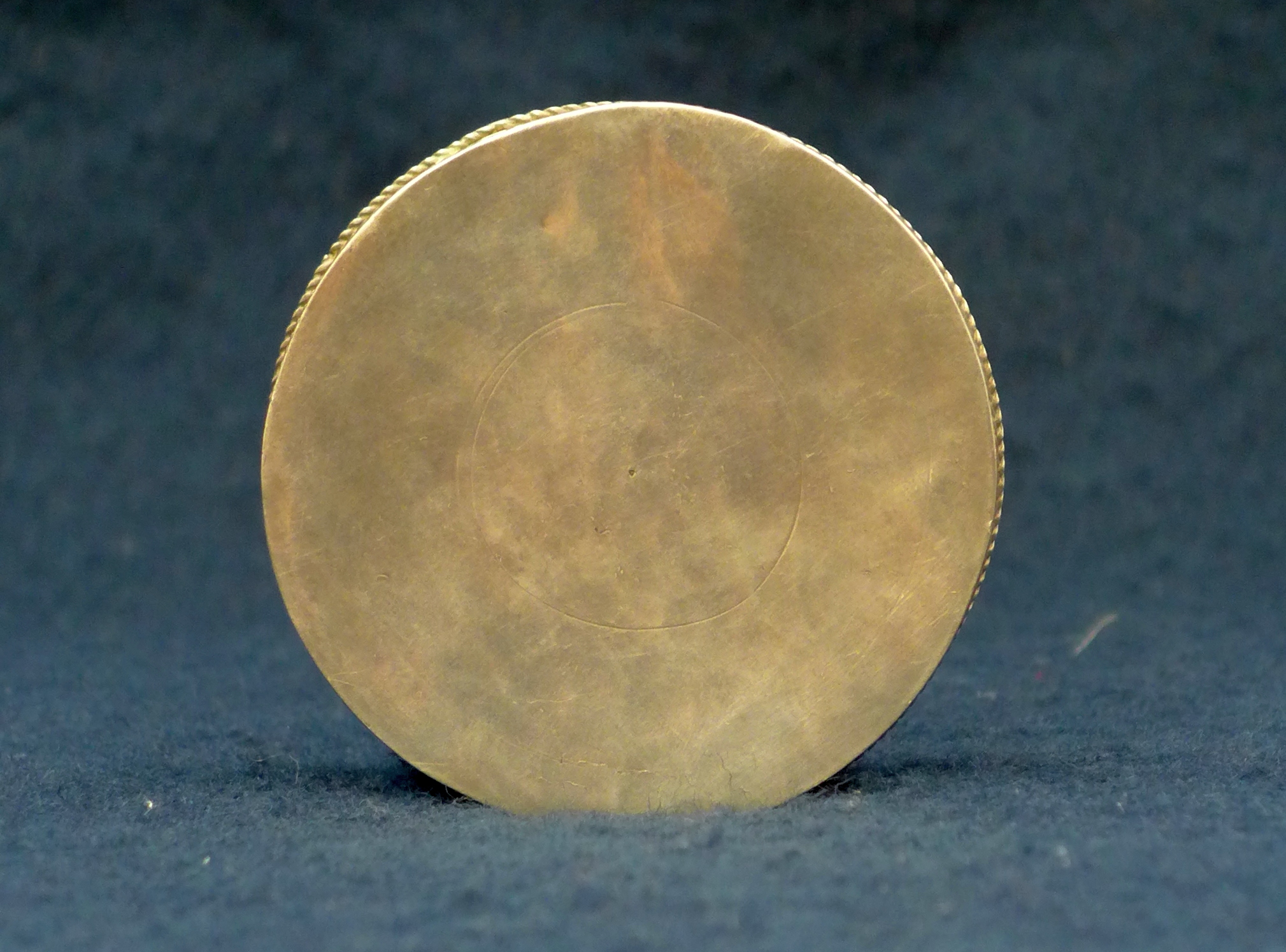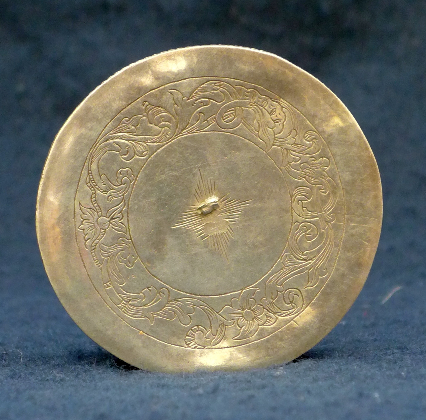 Cajita circular con guardar la Eucaristía. Sus dos partes encajan una en la otra y ambas tiene borde saliente y sogueado. Tan sólo la tapa superior va decorada, con una cenefa circular de motivos vegetales. En el centro de la tapadera lleva una pequeña argolla en la que en su momento se insertaría una cruz, hoy perdida. Alrededor de ella se marco un resplandor de rayos incisos.