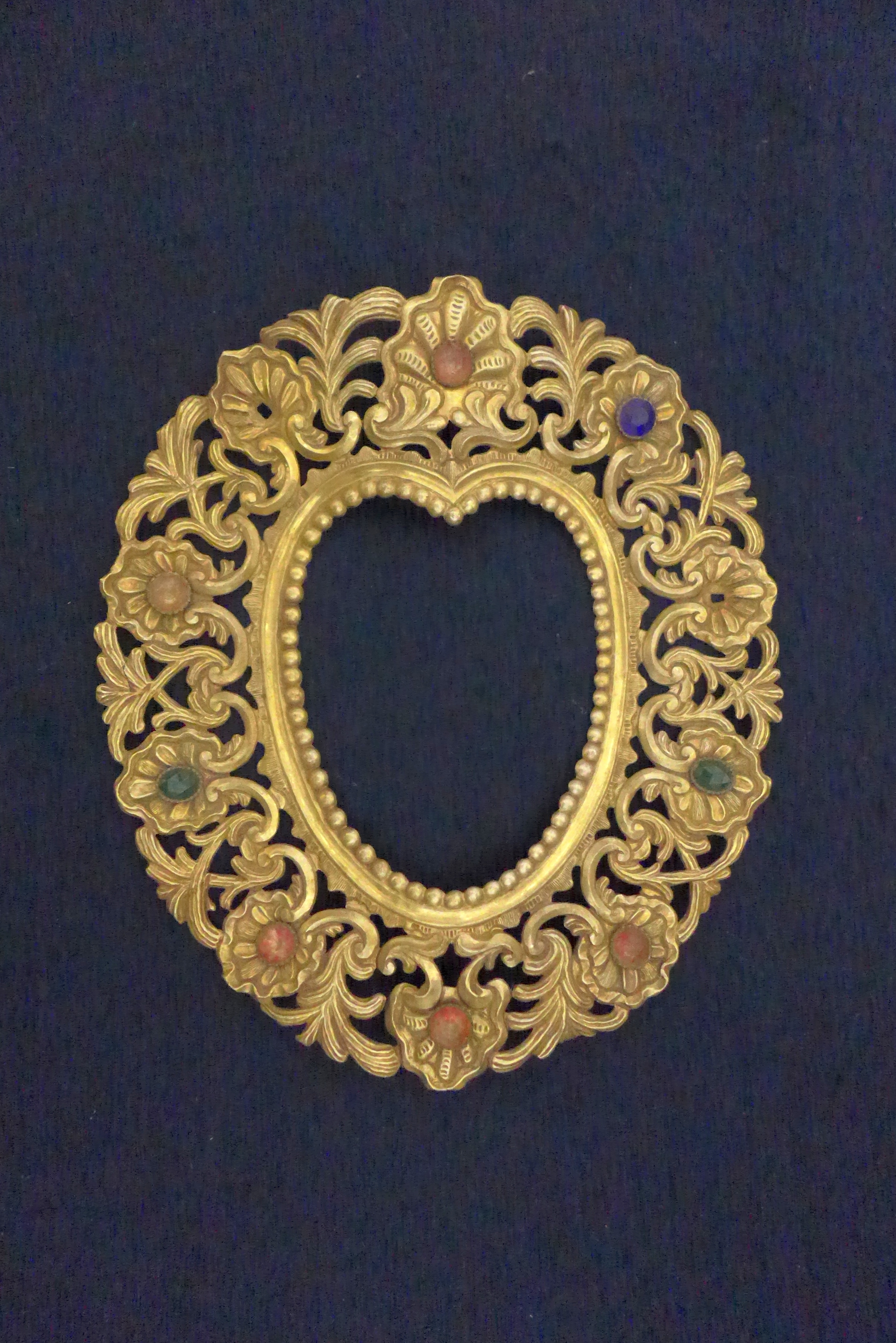 Perteneció a alguna de las imágenes marianas del templo, quizá a la Virgen del Rosario. Su aro interior tiene forma acorazonada y se rodea de una moldura de contario. Alrededor se despliega toda una panoplia de motivos rococó, como conchas, rocallas, ces y vegetales desnaturalizados. En cada una de las rocallas se insertó una piedra redondeada de colores variados.