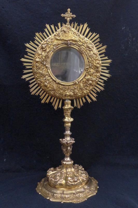 Custodia de tipo sol que hermana con producciones bien conocidas llegadas desde talleres andaluces de platería como Córdoba. En línea con la estética rococó de la pieza, sus perfiles y ornatos son todo lo movidos, sinuosos y abultados como corresponde. El pie tiene forma abullonada, pero se precede una pestaña saliente e igualmente cuajada de decoración, con exornos florales, querubes y medallas con bustos. El nudo tiene forma troncocónica invertida, pero decoraciones que lo envuelven por completo; arriba y abajo lo flanquean cuellos de forma cóncava. El sol lo forma una gran Gloria llena de nubes, espigas, racimos de uvas, angelitos...y una figura de Dios Padre en su parte alta. Alrededor rayos rectos, biselados y desiguales le confieren su definitorio aspecto.
