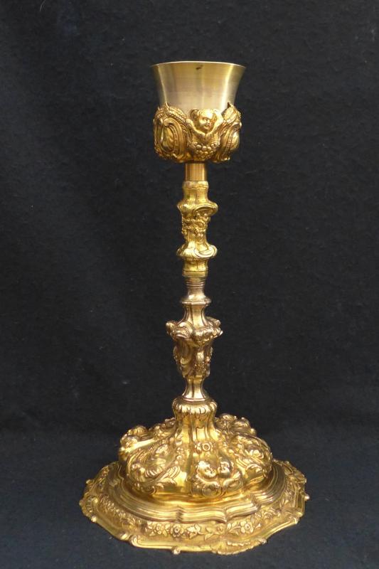 La pieza tiene la particularidad que se le desenrosca el ostensorio y tiene una copa acampanada y con rosa repujado con motivos ornamentales ya enunciados.