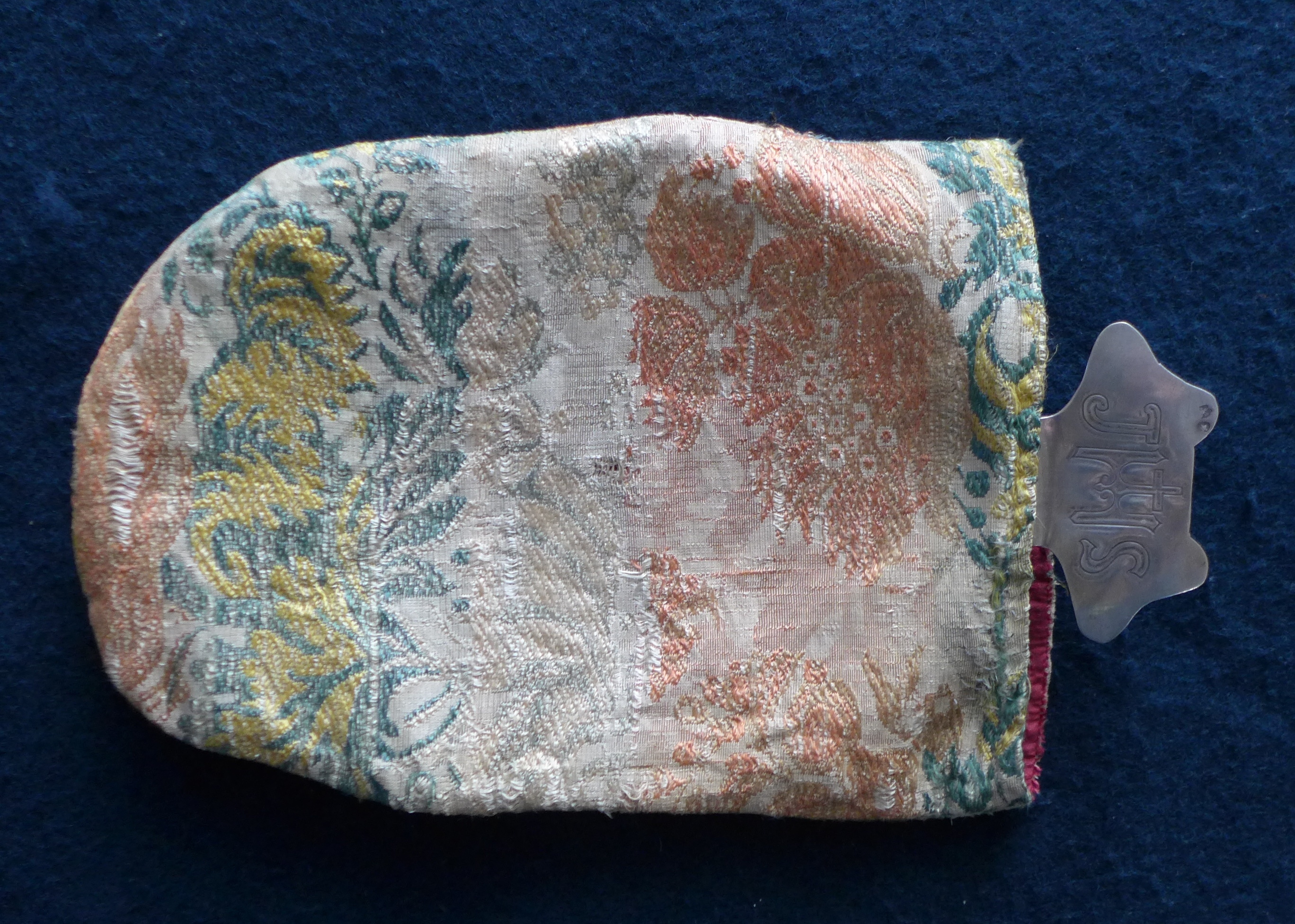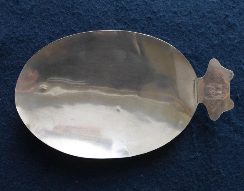 Sencilla bandeja de forma ovalada y escasa profundidad, con asa lateral de perfil sinuoso. En esta última se grabó el monograma "IHS". Se trata de una pieza de factura contemporánea, con la sencillez adecuada a sus fines. Conserva funda textil.