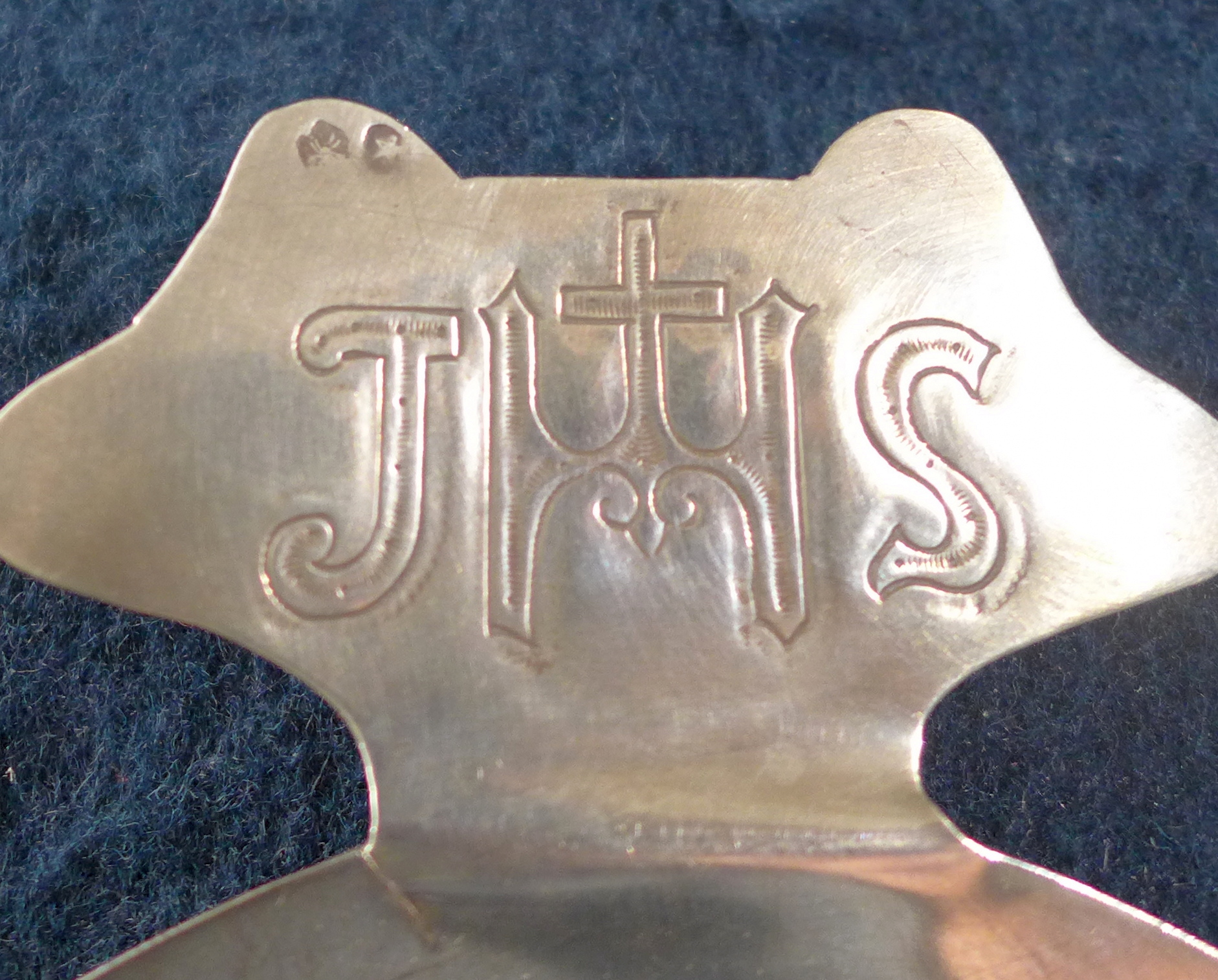 En el anverso del asa muestra dos punzones, uno frustro e irreconocible, el otro una estrella de cinco puntas (utilizado actualmente para marcar la plata de ley)